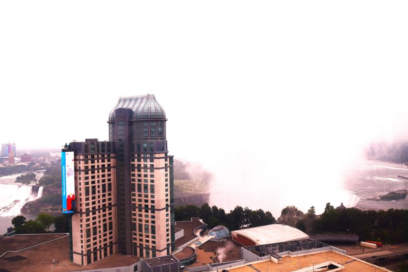 ヒルトン・ナイアガラフォールズはナイアガラの滝を一望できるホテルの1つ。場所はナイアガラの滝の前の丘の上にあるホテル。この辺りは様々なホテルが並んでいて、ホテルストリートな感じです。テーブルロックまでは徒歩とケーブルカーを使えば15分ほどで着くので、便利な立地ではあります。