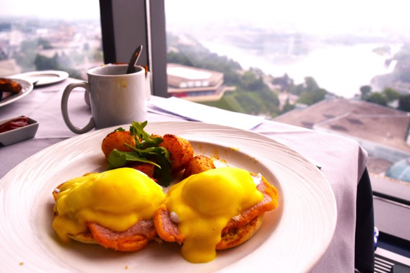 朝食は33階にある滝を眺めることができるレストラン「ウォーターマーク・フォールズビュー・ダイニング」でいただくことができます。ココからはカナダ滝、アメリカ滝の両方の滝を見ることができます。朝7時半ごろまでに行けば窓側の席に座れると思います。朝食はカナダのホテルの一般的な値段ですが、私はヒルトンゴールドだったため、コンチネンタルの朝食かメニューから15ドル引きでした。