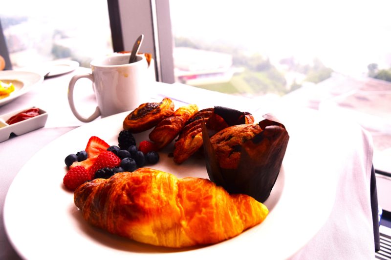 コチラはヒルトンゴールドで無料のコンチネンタルブレックファスト。クロワッサン、マフィン、ペストリーとまさにパンオンリー(笑)。これだけでも十分お腹いっぱいにはなるんですが、ちょっと寂しい感じ。複数人なら通常メニューも頼んでシェアするのがいいかと思います。